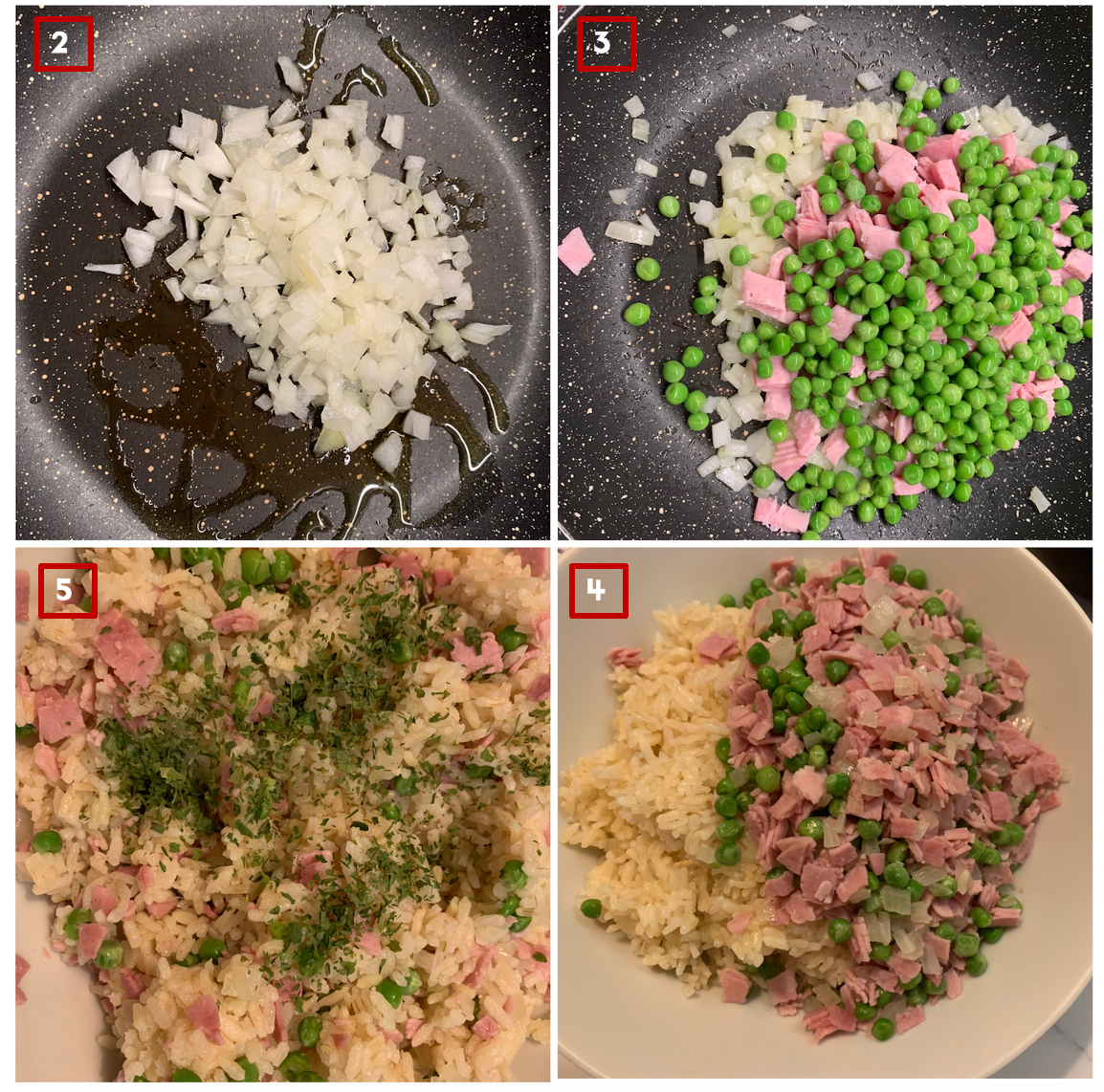 4. 큰 볼에 밥과 볶은 양파, 완두콩, 햄을 넣고 섞어준다.