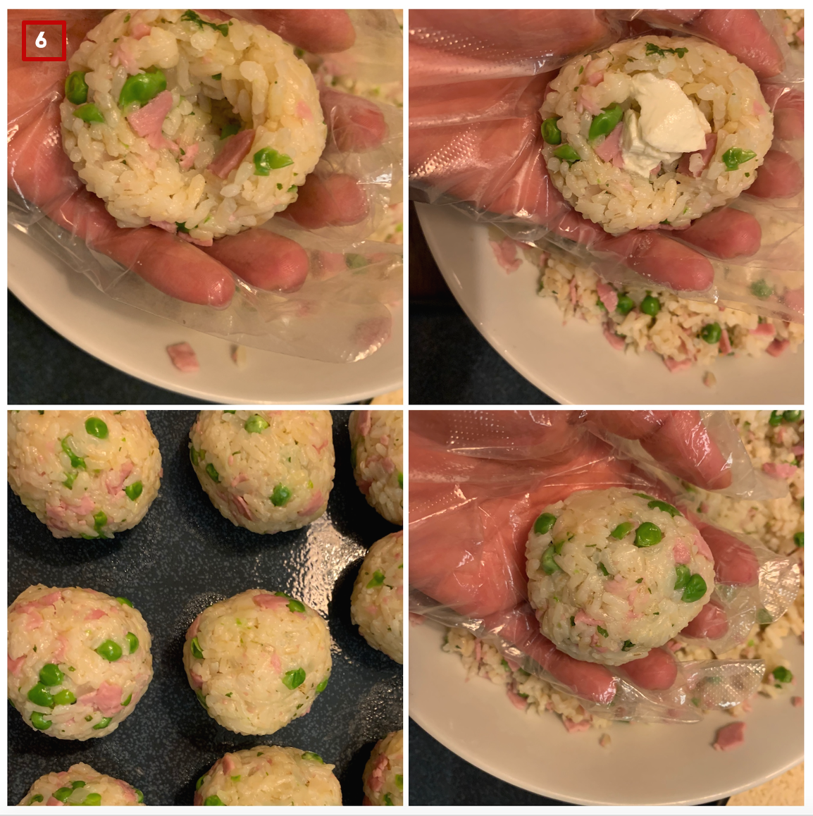 6. 밥을 한입 크기로 뭉쳐낸 후 가운데 큐브 형식으로 자른 모짜렐라 치즈 혹은 슈레드 치즈를 넉넉히 넣고 잘 뭉쳐준다.