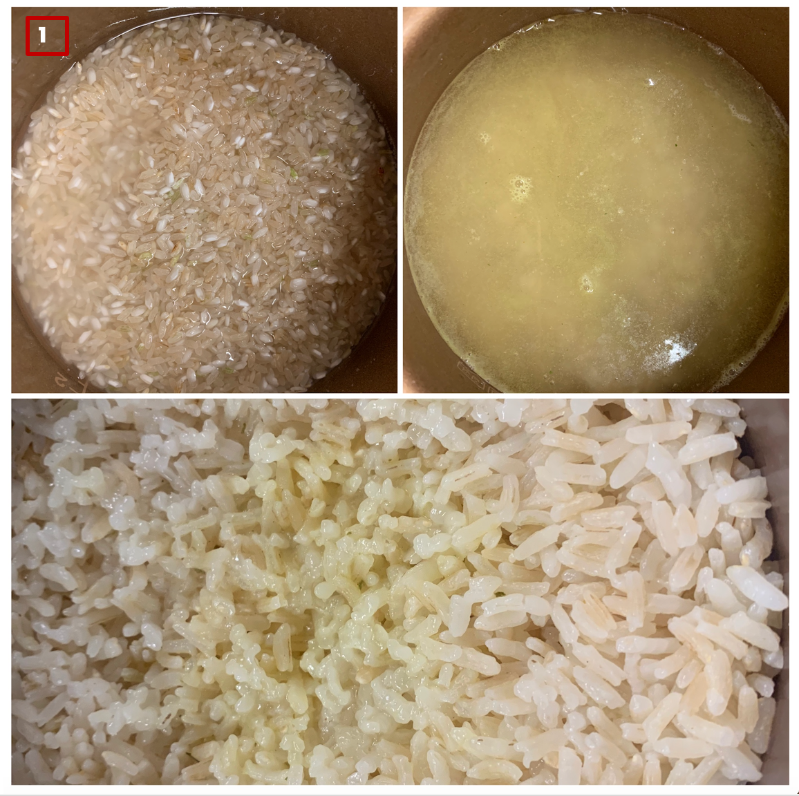 1. 따로 리조토까지는 만들지는 못하더라도 리조토처럼 간이 살짝 된 밥을 전기밥솥을 이용해 간편하게 지어보자 ! 평소대로 쌀을 잘 씻은 후 물을 맞출 때 맹물 대신 치킨 스톡 큐브 하나를 미리 풀어놓은 미지근한 물과 와인을 넣으면 끝. 액상형 치킨 스톡을 사용한다면 와인을 먼저 넣고 물로 높이를 맞춘 후 치킨 스톡을 한 큰 술 더해주고 백미 취사 버튼을 누르면 된다. 너무 질지도 고슬고슬하지도 않은, 살짝 양념된 밥을 전기밥솥이 알아서 완성해준다 ! 큐브형 스톡을 사용했다면 사진처럼 양념이 가운데로 몰리니 잘 저어준다.