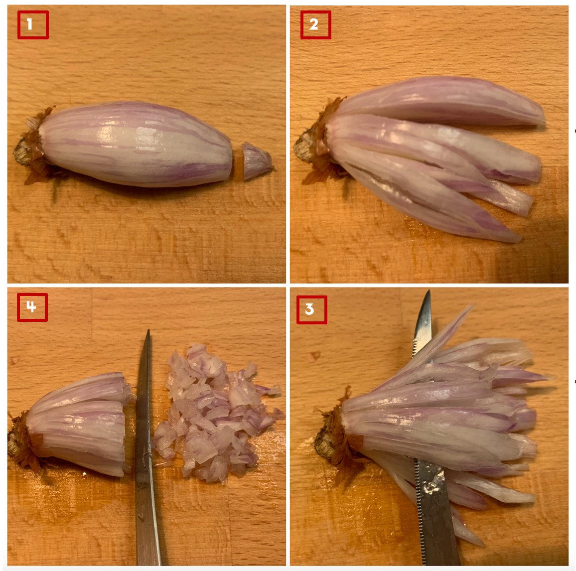 최대한 얇고 잘게 잘라야 샬롯 양파의 풍미를 제대로 느낄 수 있는데 작아서 양파 썰기보다 난이도가 높다. 잘 드는 칼로 아래 방법을 쓰면 제일 편하게 자를 수 있다.