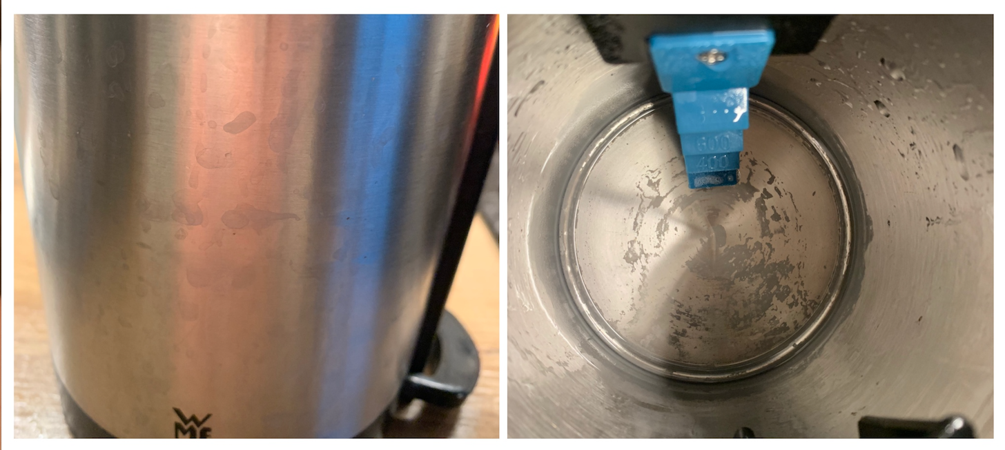 며칠만 방치해도 이렇게 심한 물 자국과 석회질 침전물이 생기는 처참한 커피 포트. 그나마 생수를 끓일 때가 많아서 이 정도지, 잘못 하가다 가는 바닥이 안 보이는 답 없는 지경까지 갈 수도 있다.