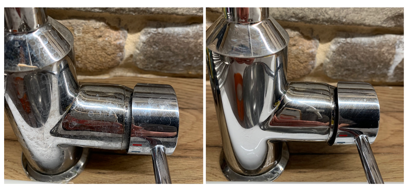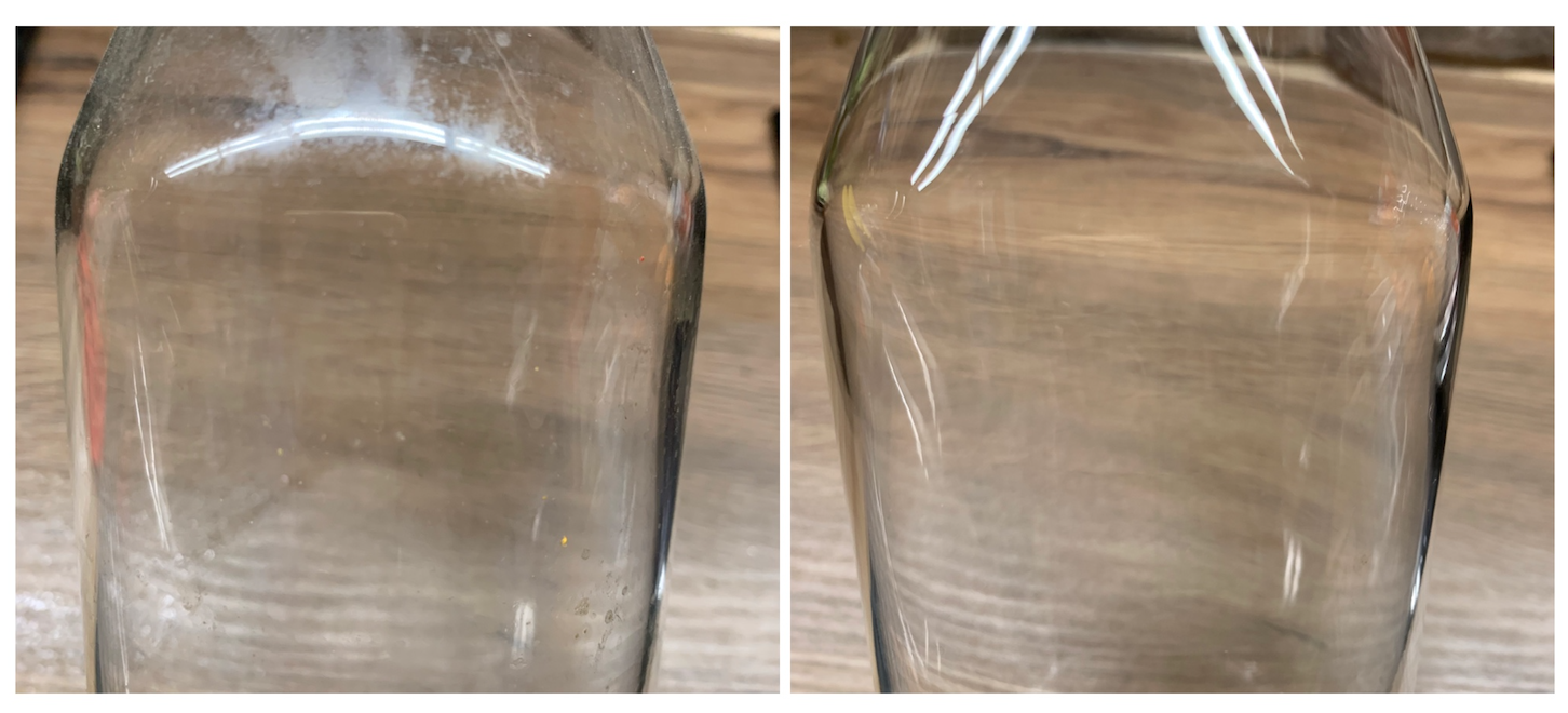 얼룩덜룩 쓰기 싫게 생긴 수도꼭지도 다시 반짝반짝! 역시 수세미의 부드러운 면으로 구석구석 문질 문질 닦아준 후, 마른행주로 남은 물기를 완전히 제거해주면 된다. 그래도 커피 포트 물이 남았으니 이번에는 똑같은 방식으로 한동안 방치해둔 유리병 청소에 도전해보자. 결과는 마찬가지로 아름답다.