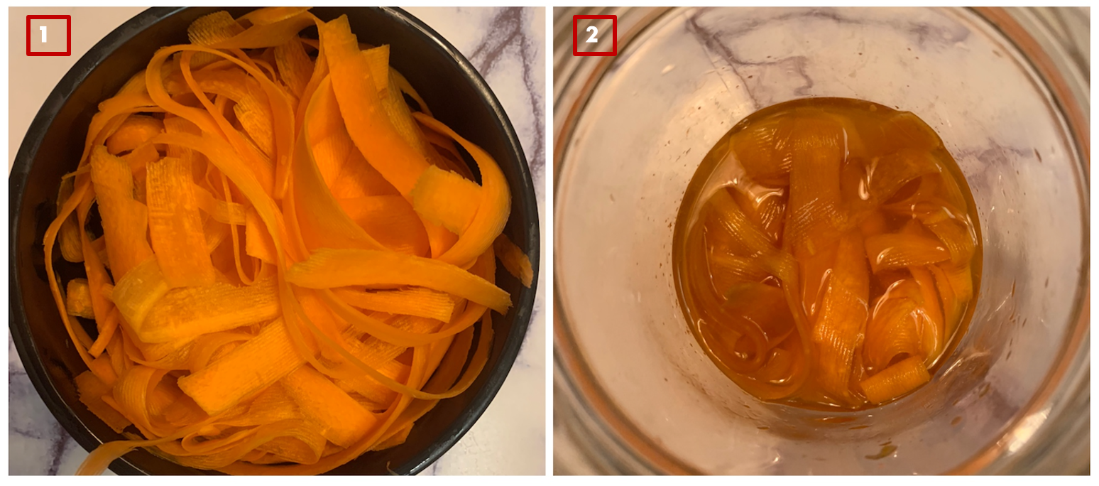 1. 껍질을 벗긴 당근은 감자칼이나 필러로 얇고 길게 잘라서 준비. 귀찮지 않다면 채 썰어서 준비해도 좋다.
