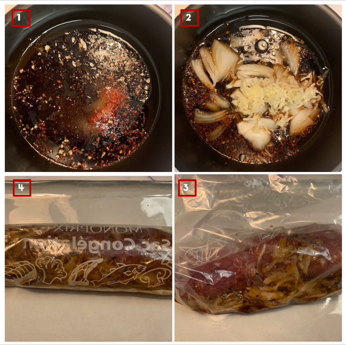 3. 냉동 지퍼 백에 돼지 안심과 함께 넣고 잘 닫은 다음, 양념이 골고루 배어들 수 있도록 조물 조물 문질러 주고