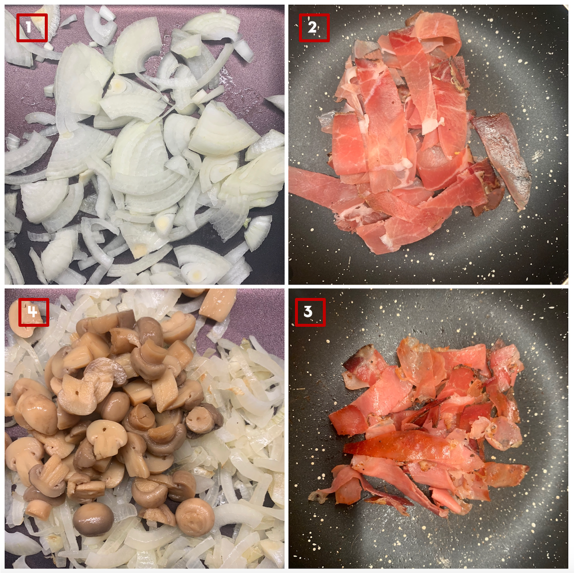 2. 다른 팬에는 버터없이 잘게 자른 생햄이나 베이컨을 올려서 역시 중불에서 굽는다.