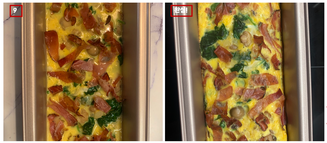 9. 오븐 굽기를 택했다면 : 미리 버터를 넉넉히 발라둔 오븐용 그릇이나 틀에 계란 반죽을 붓고, 남겨둔 베이컨을 토핑처럼 올려준 후 약 3,40분간 윗면까지 잘 익도록 구워주면 완성 !