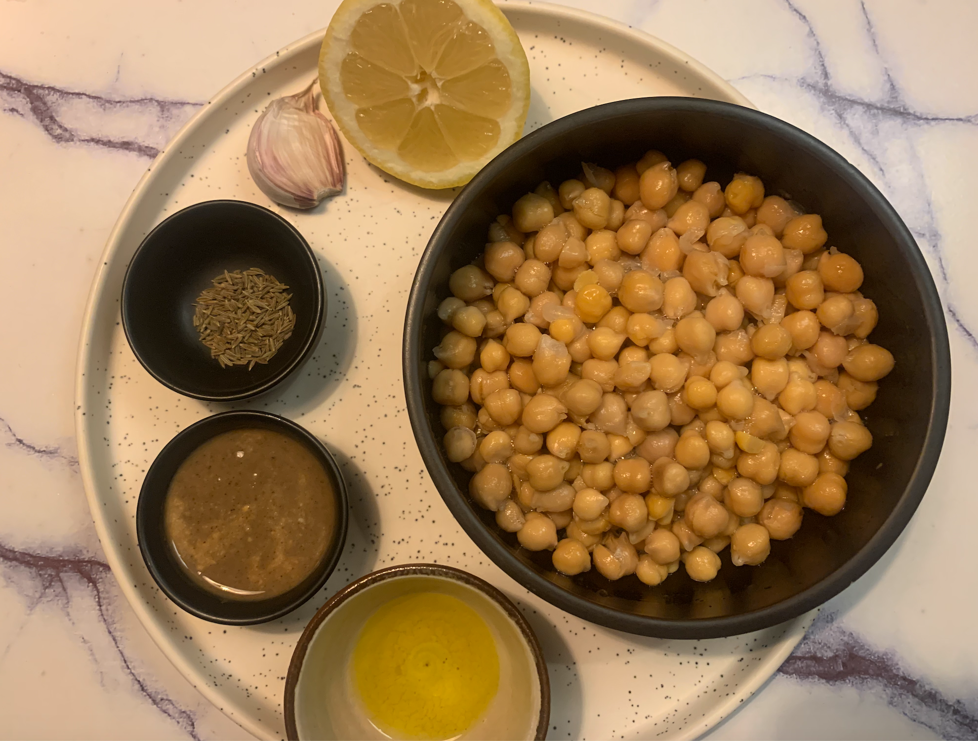 2. 타히니 소스와 큐민, 잘게 자른 마늘과 레몬즙을 추가한 후 고운 제형이 나올 때까지 갈아주고