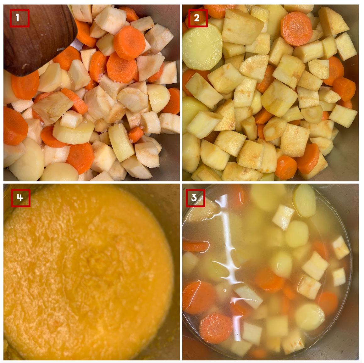 1. 약간의 버터를 두른 냄비를 중불에 올려 잘게 썬 파스닙, 감자, 당근과 티스푼 하나 분량의 소금을 넣고 10여분 동안 가끔 섞어주면서 볶아준다.