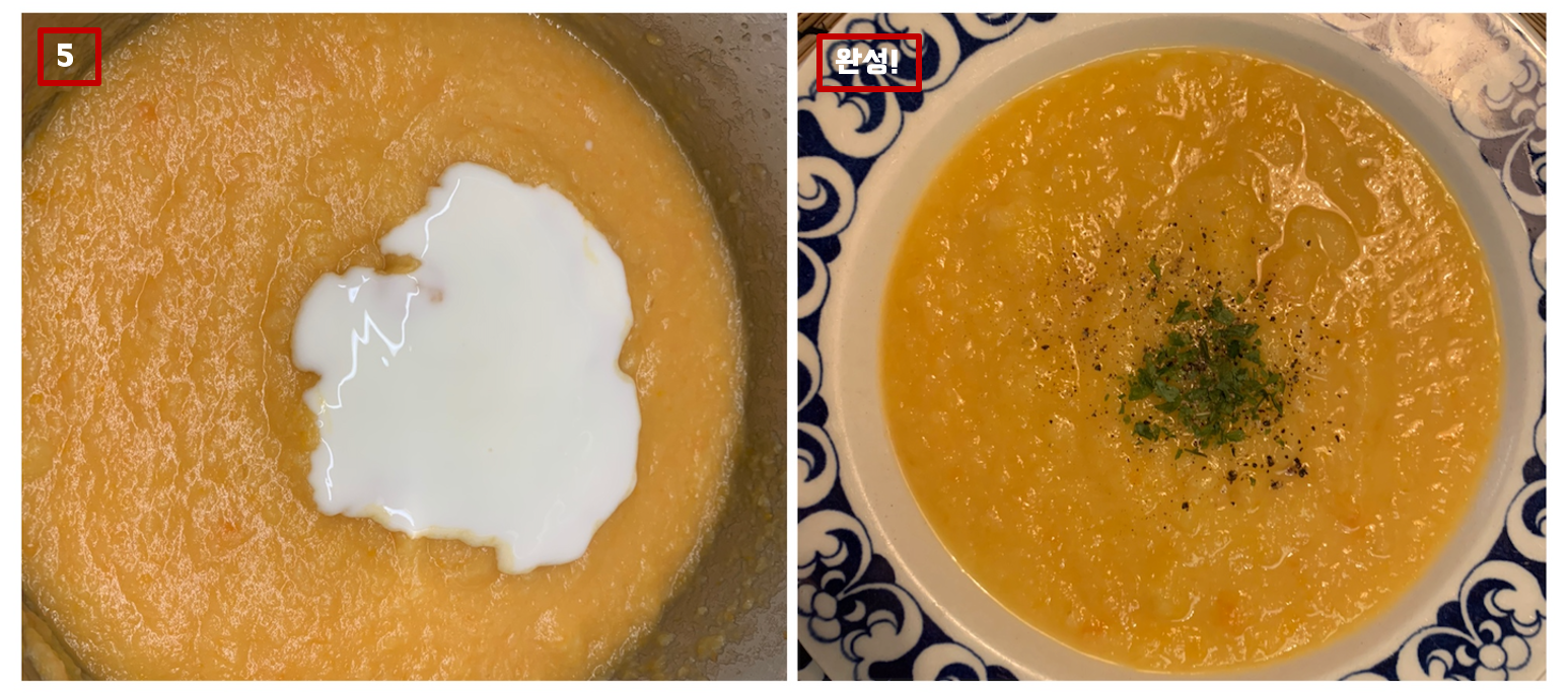 6. 건파슬리와 후추를 뿌려서 아주 뜨겁게 서빙한다. 파스닙의 달달함과 독특한 뿌리 맛이 섞인 든든한 파스닙 야채 수프와 함께 건강한 식사를 즐겨보자 !