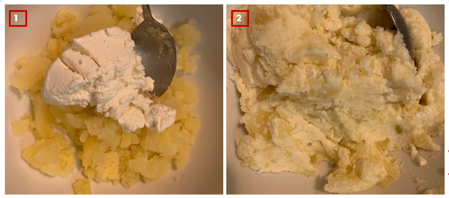 1. 큰 볼에 포크로 대충 으깬 감자, 리코타 치즈와 우유, 굵은소금을 더해준 후
