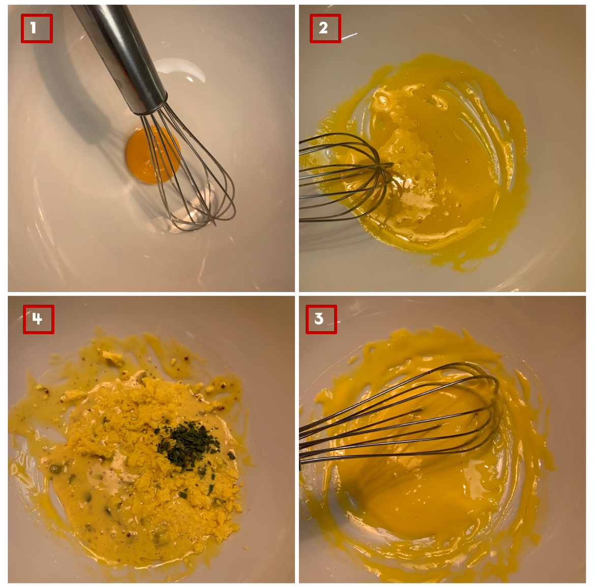 4. 머스타드와 소량의 소금, 후추 > 식초 > 잘게 다진 나머지 재료와 건파슬리 순서로 넣고 잘 섞어주면 완성 !