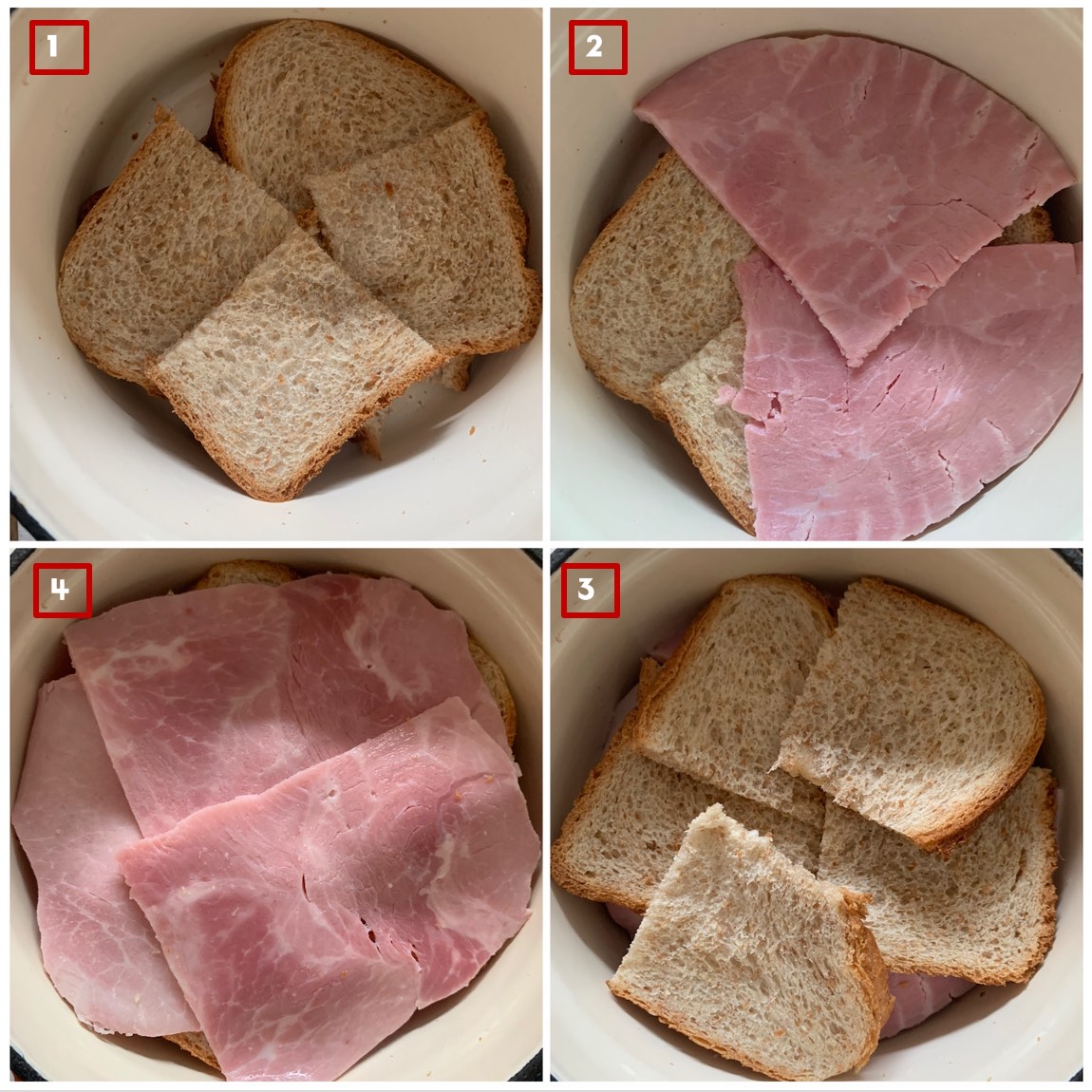 1. 토스터에 노릇노릇하게 구운 식빵을 4 등분해서 오븐용 그릇 바닥에 반을 먼저 차곡차곡 쌓아주고