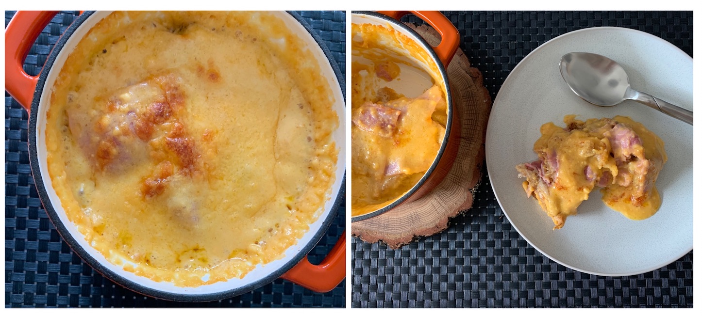 8. 앞서 준비해 둔 오븐용 그릇에 맥주와 녹인 체다 치즈를 넣고 오븐에서 약 10-15분간 노릇노릇 구워주면 완성 !