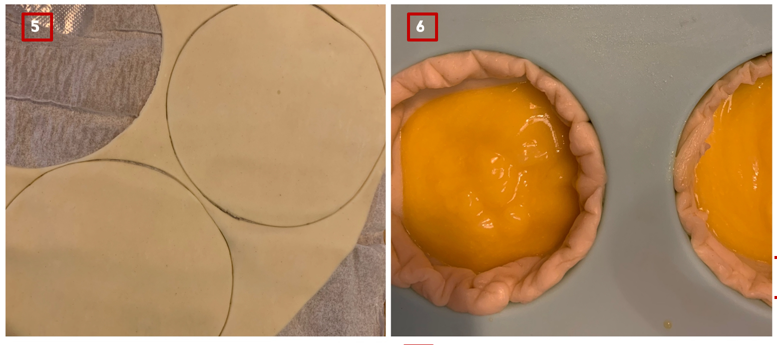 6. 내부에 버터를 바른 틀에 원형으로 자른 생지를 사진처럼 구겨넣지 말고 말고 넣어준 후 에그타르트 필링을 2/3 정도 채워 넣고 200도에서 15분간 굽다가 그릴 기능으로 돌려 윗면이 살짝 탈 때까지 2분 정도 아주 잠깐 더 익혀주면 완성 !