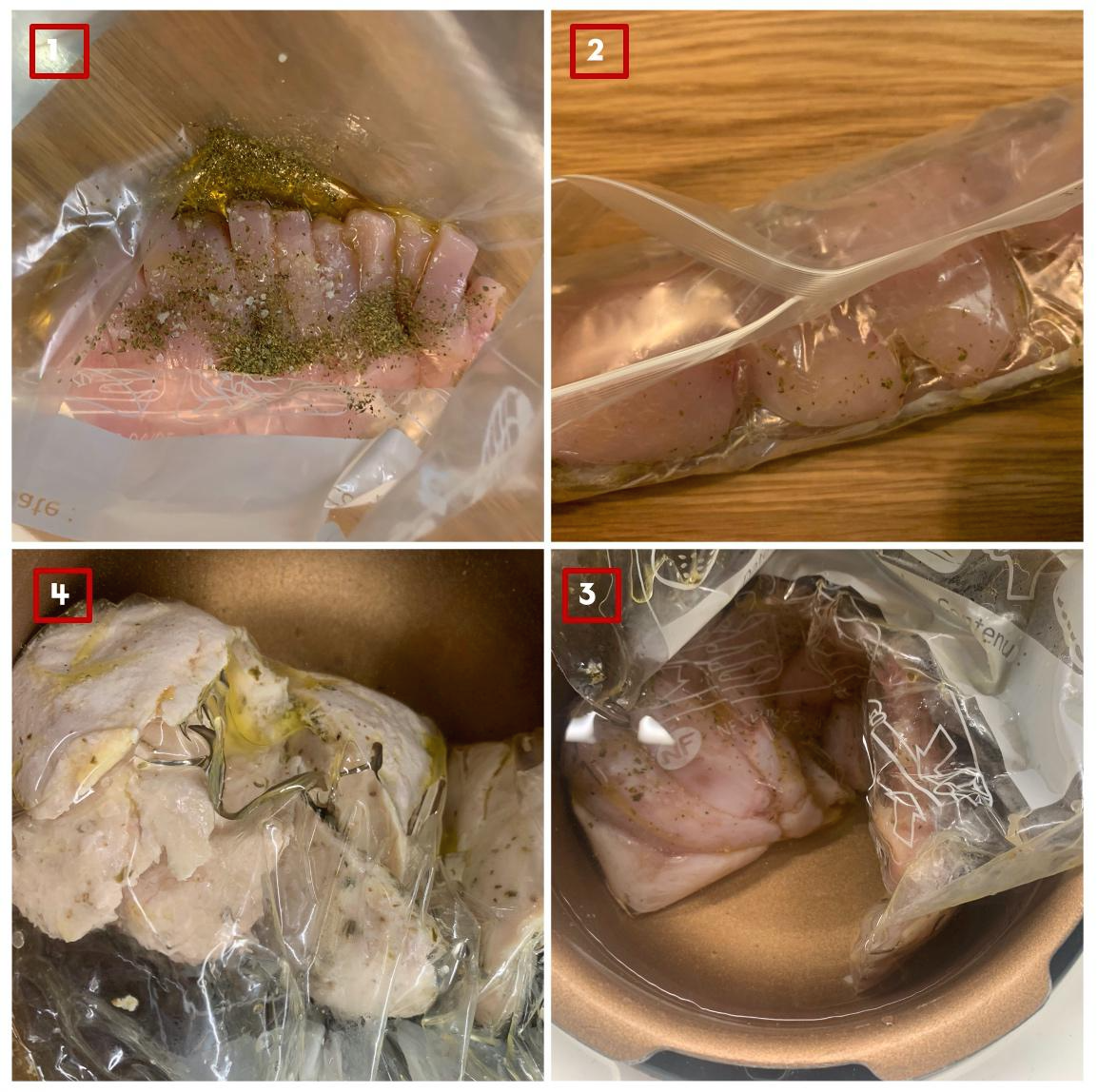 생각만큼 쉽지 않다면 지퍼백을 2 cm 정도만 열어놓고 닭가슴살이 충분히 잠기도록 물에 넣어서 공기를 빼주는 방법을 써도 좋다.