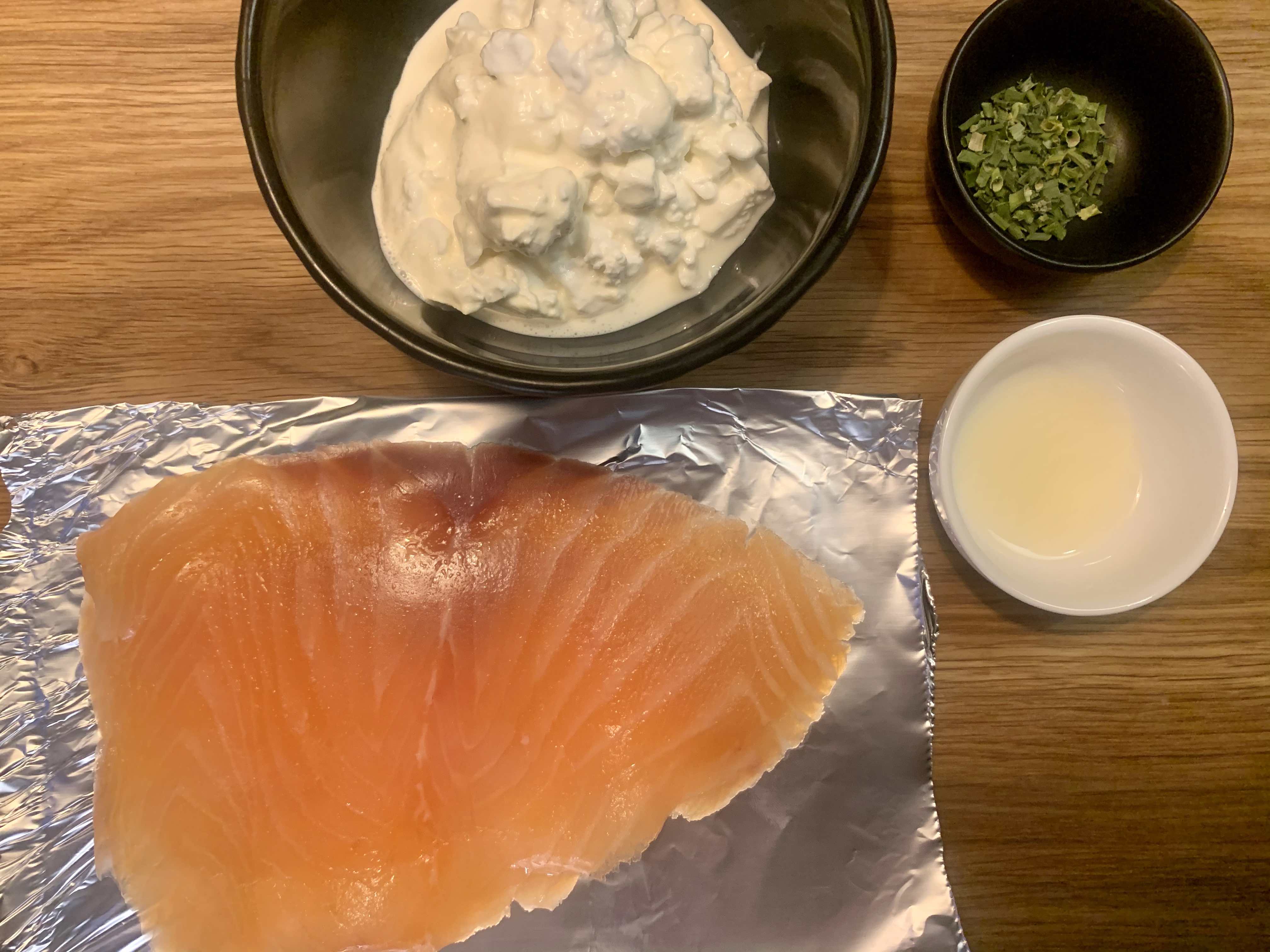 3. 사진처럼 위쪽으로 연어 슬라이스가 더 많이 남도록 코티지 치즈를 올리고