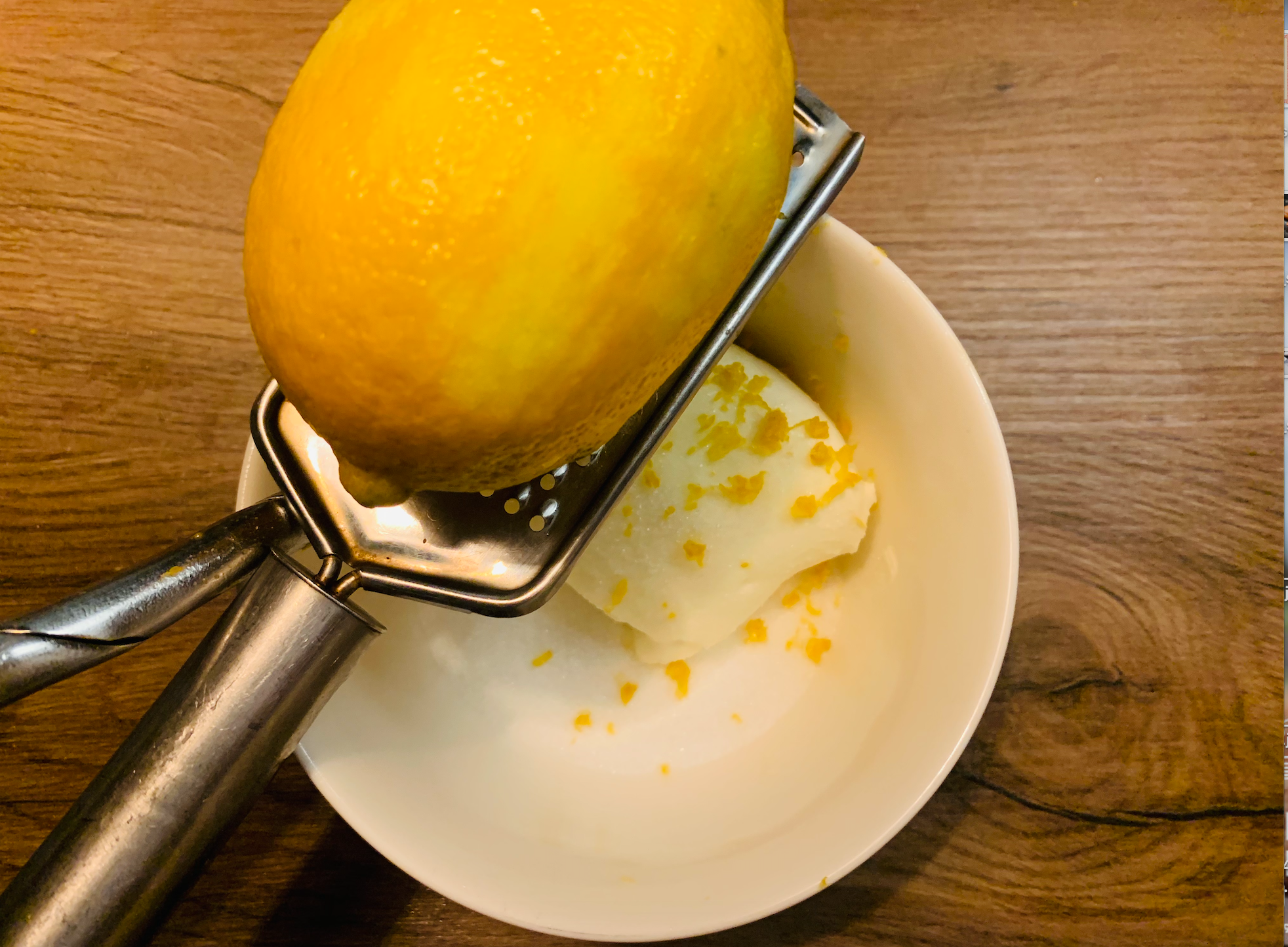 2. 깨끗이 씻은 레몬을 강판에 갈아 제스트로 만든 후 마스카포네 치즈 위에 뿌려준다.