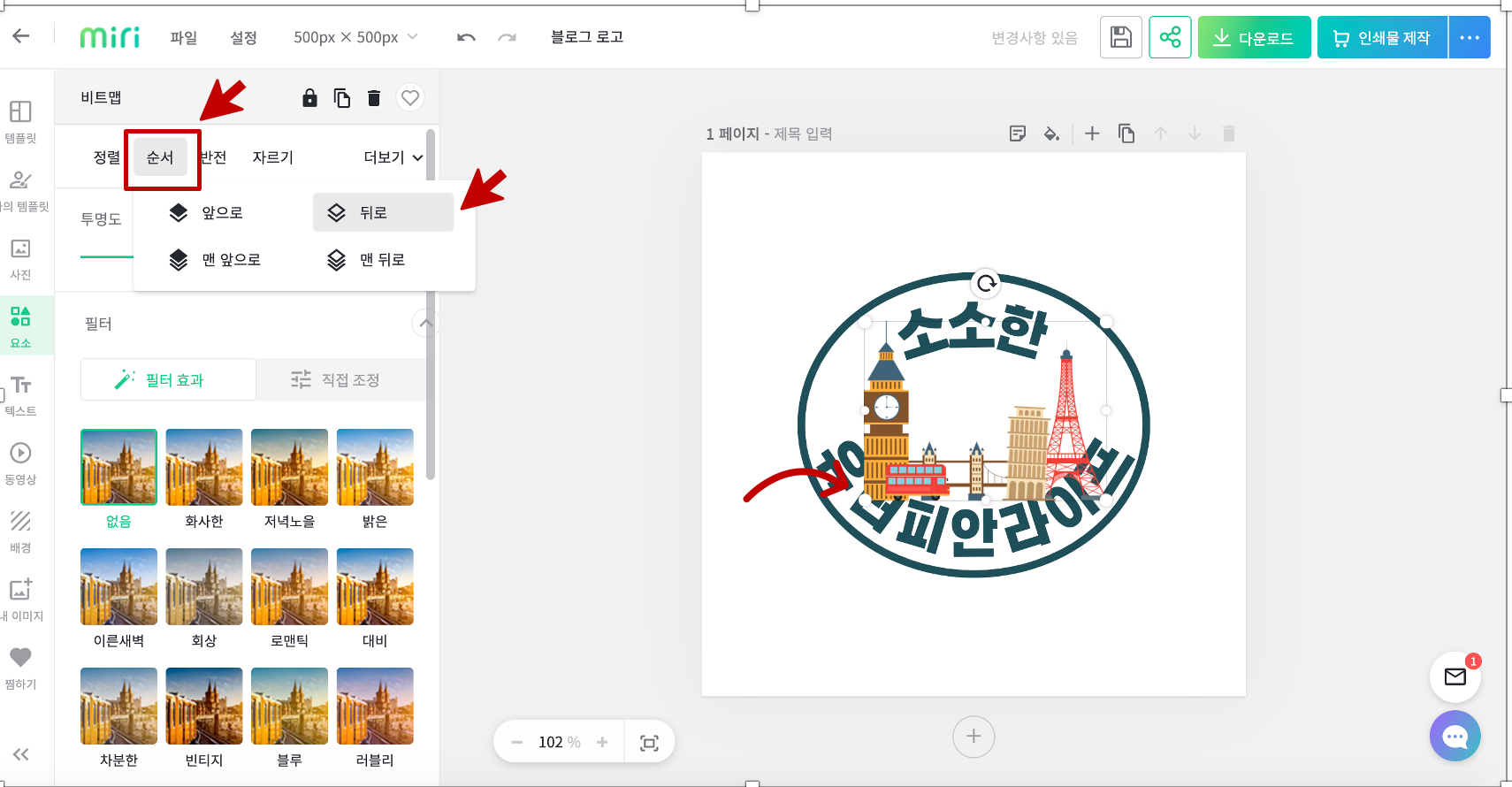 사이즈는 알아서 줄였는데 그림이 글씨 위로 가있다 ? 이럴 때는 왼쪽 도구 상단의 순서를 클릭하고 그림을 뒤로 밀어주면 된다.