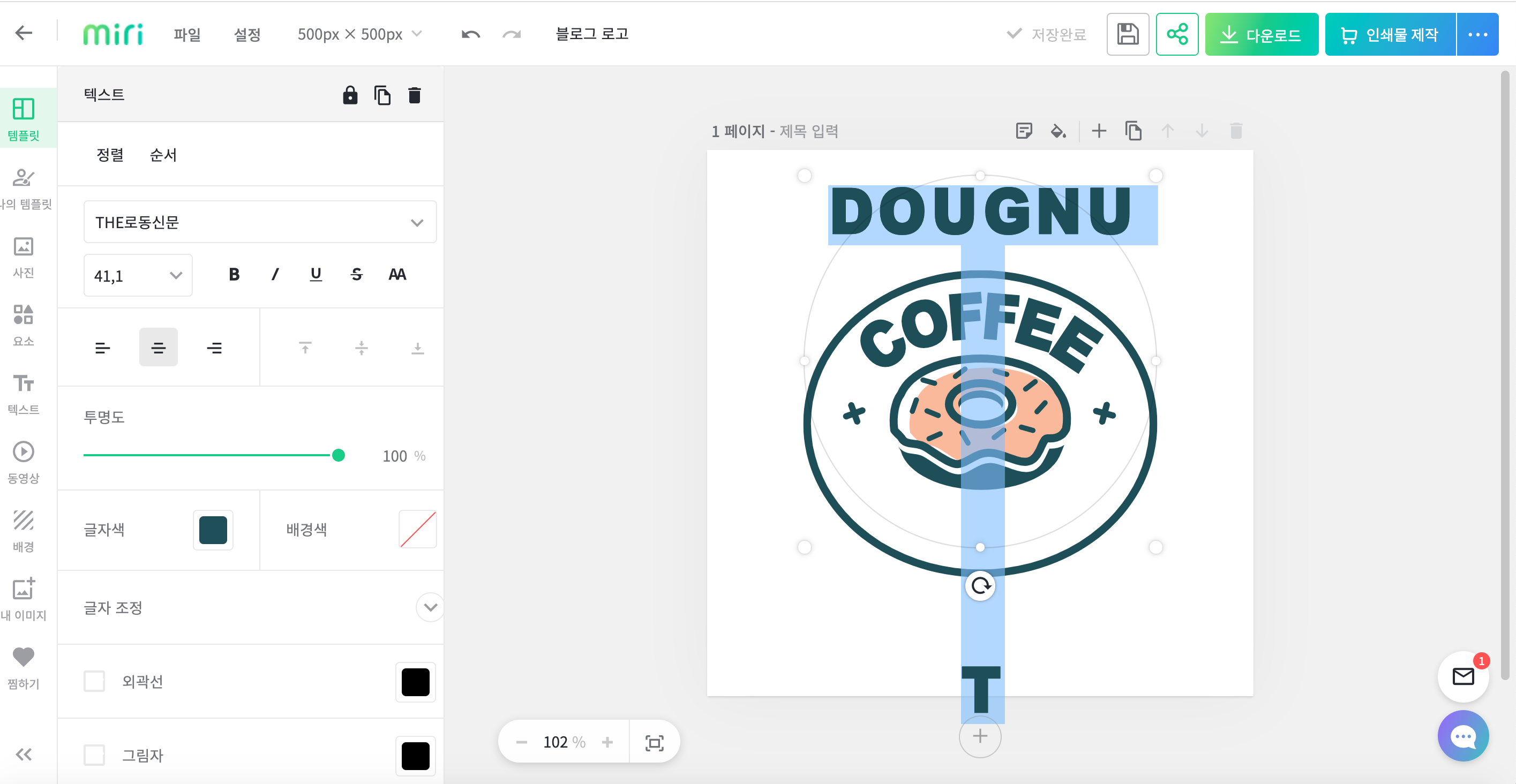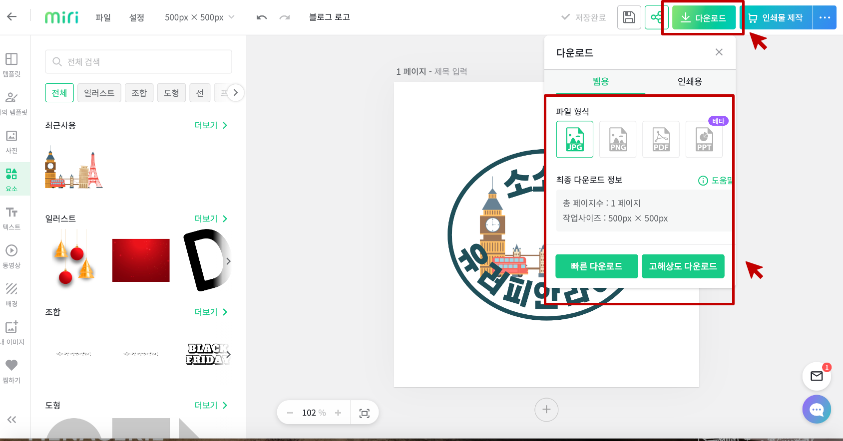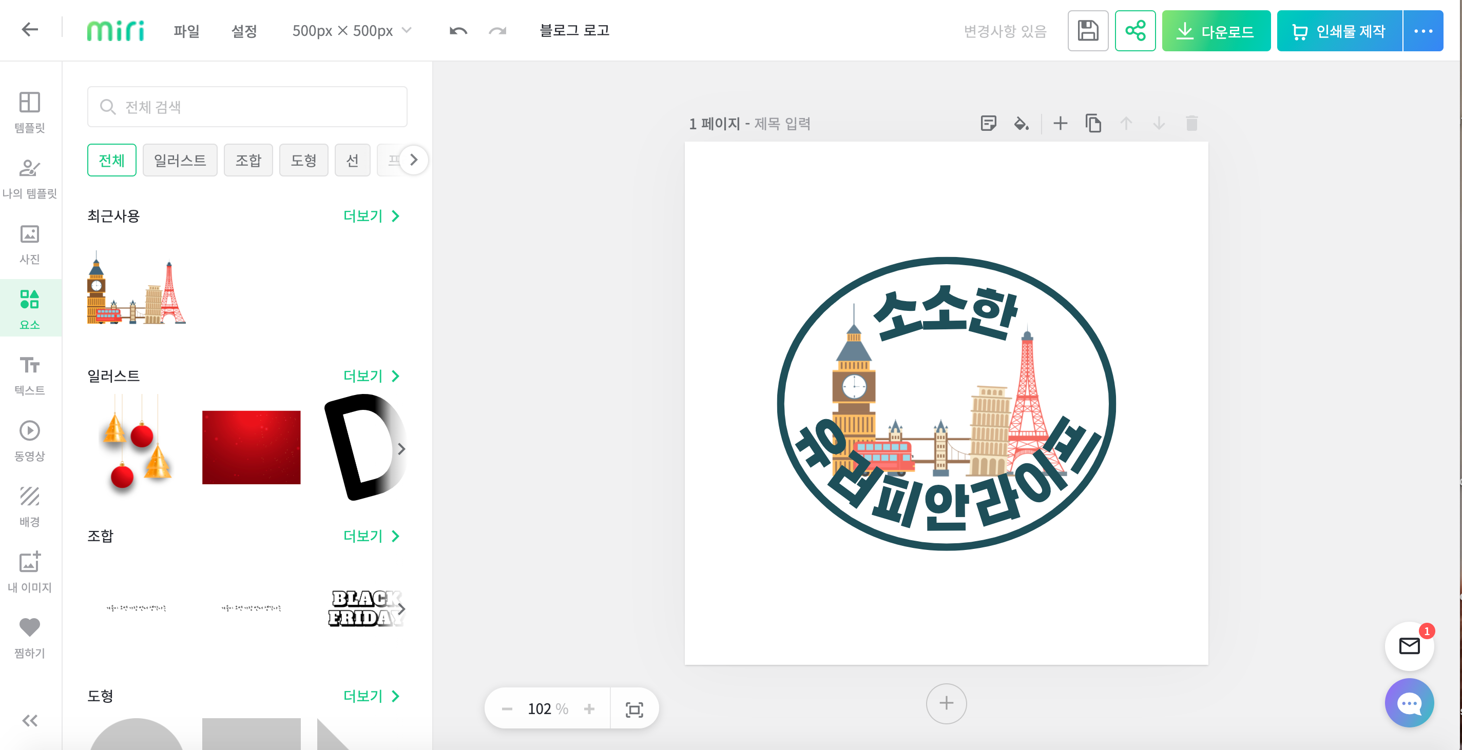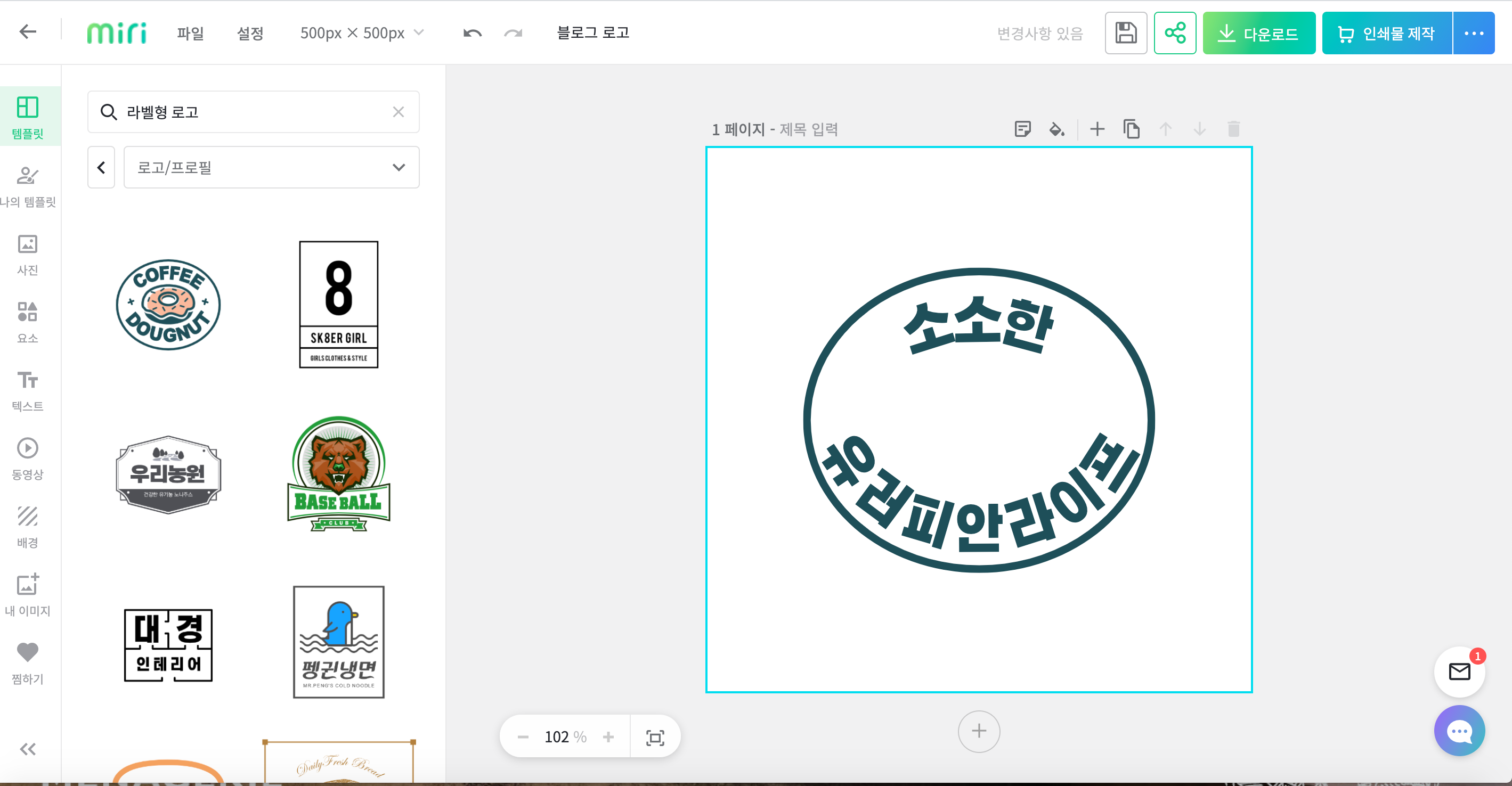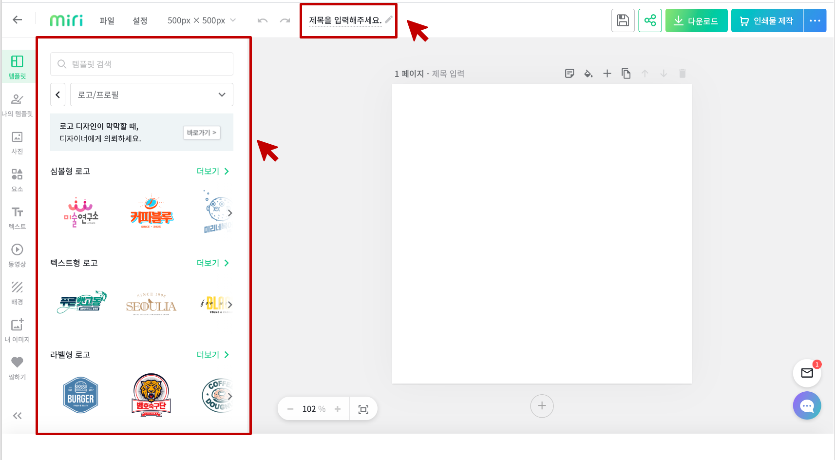 상단에 파일 제목을 적고, 왼쪽의 로고 템플릿에서 원하는 디자인 골라서 클릭 !
