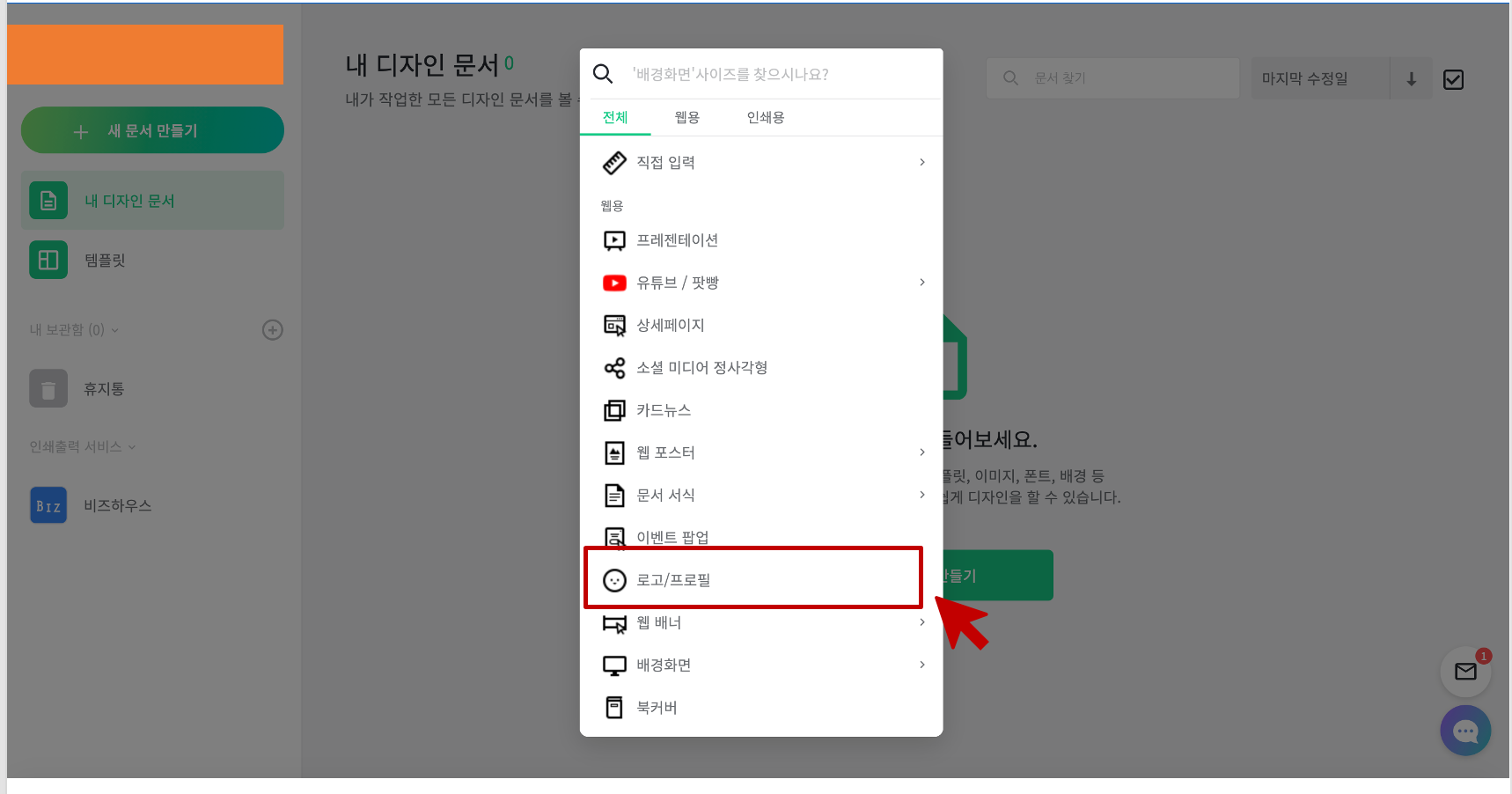 새 문서 만들기 클릭 후 나오는 메뉴에서 로고 만들기에 도전하니 로고/프로필 선택