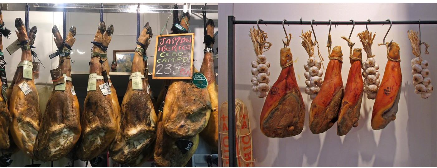 하몽 이베리코 : 스페인의 흑돼지 품종 이베리코(ibérico)의 뒷다리로 만든 생 햄. 같은 이베리코 돼지들도 농장에서 일반 사료를 먹고 자란 돼지와 일반 사료를 먹되 방목되어 운동량이 많은* 돼지에 따라 등급이 나눠지며, 도토리를 먹으면서 방목되며 고급지게 자란 돼지님들은 이베리코 데 베요타 (Ibérico de bellota)라고 불리는 고급 하몽으로 만들어진다. 숙성 기간은 약 24개월부터 48개월.