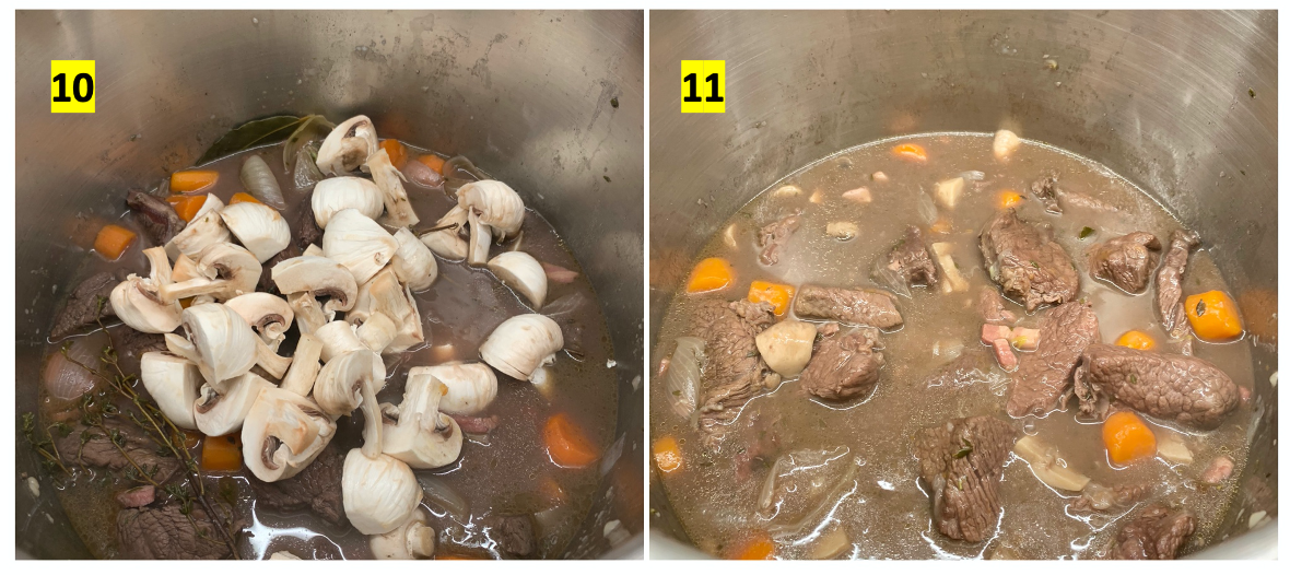 10. 2시간 가량 지난 후 4 등분한 양송이버섯을 넣고 1시간 정도 더 끓여준다. 소스를 맛보고 필요하다면 소금 간을 맞춰준다.