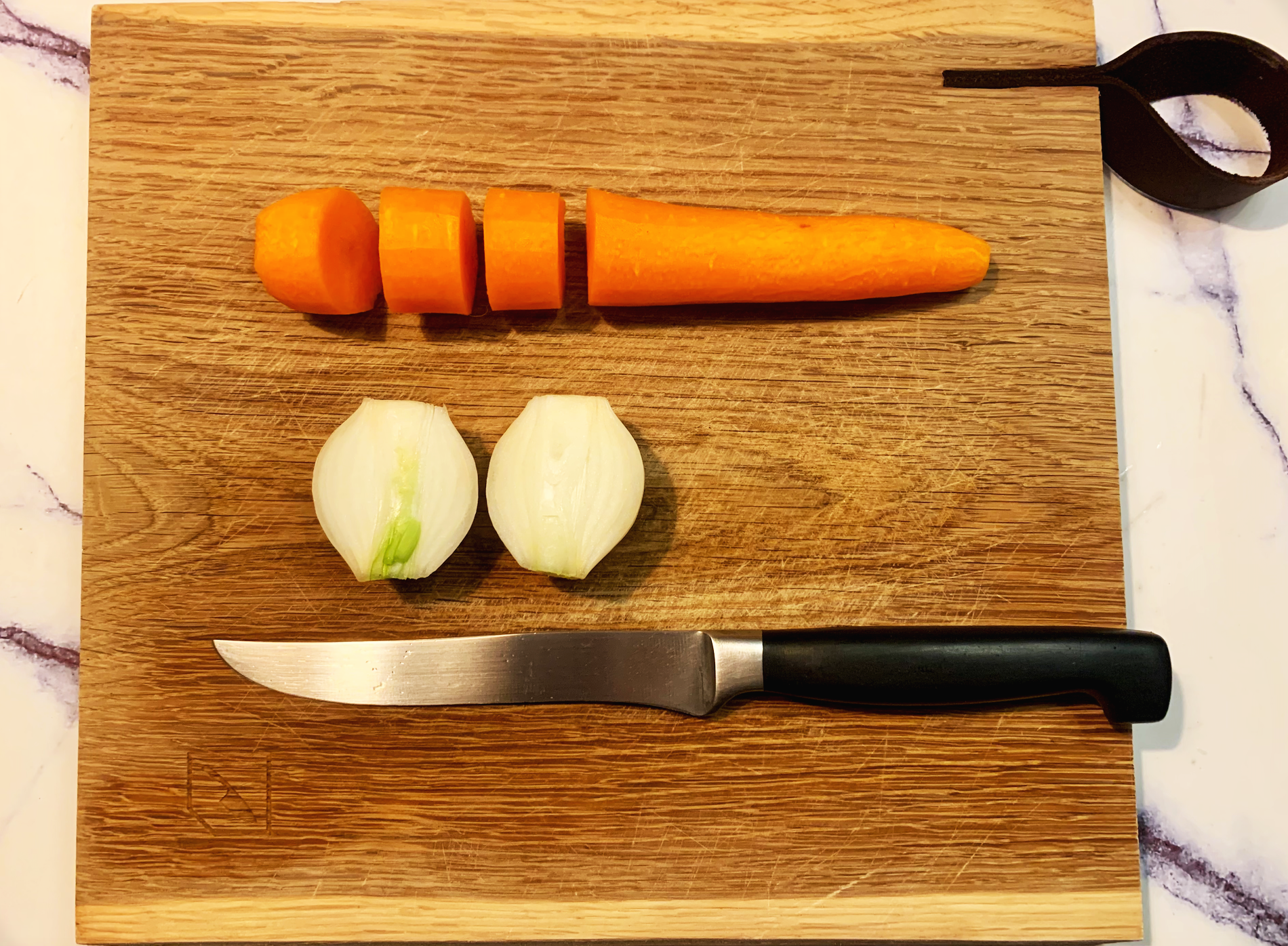 1. 손질한 당근은 두툼하게 링 썰기 해주고, 양파는 반으로 잘라준다.