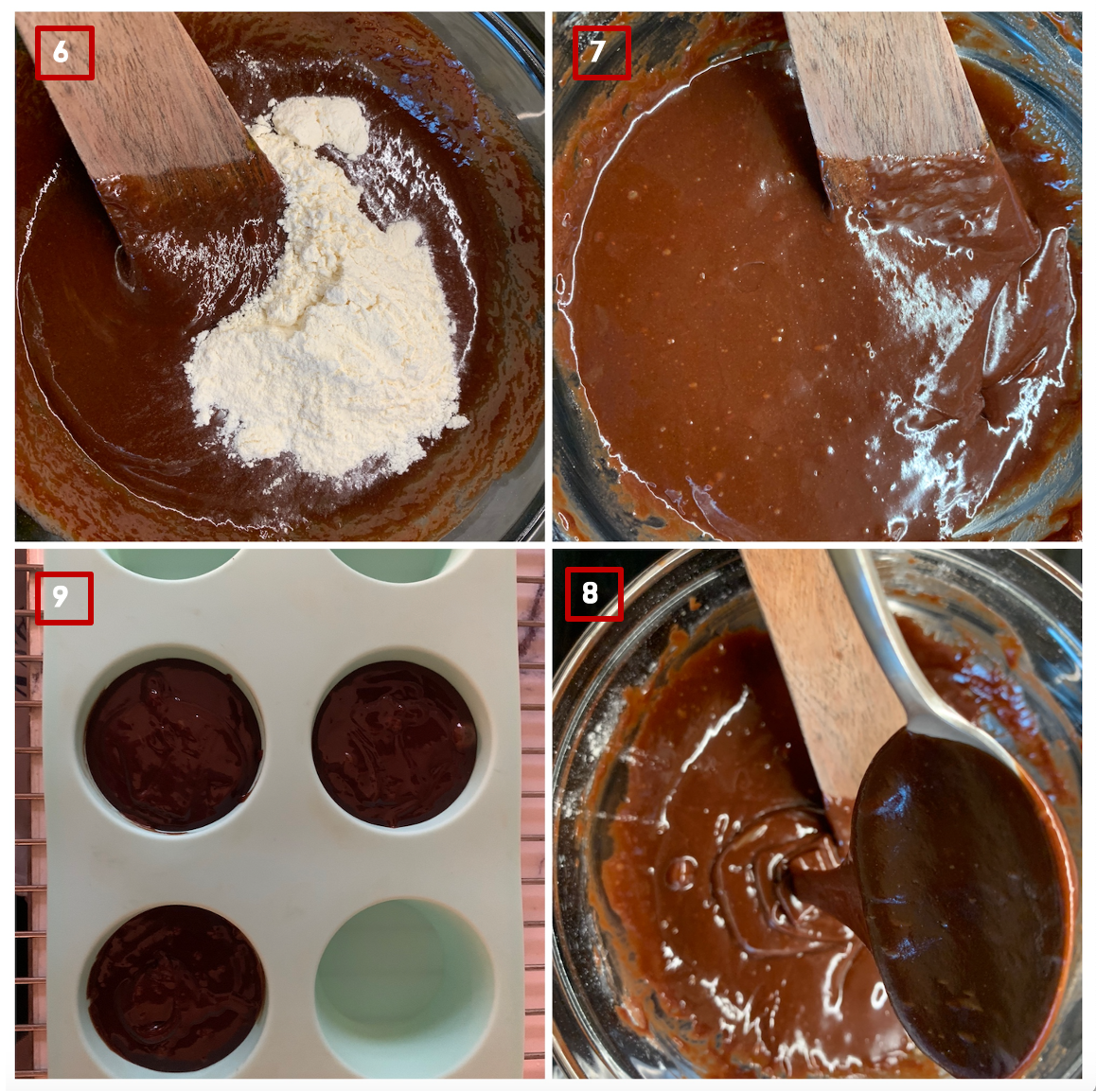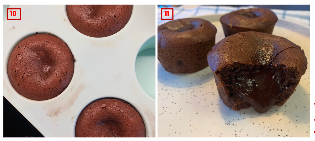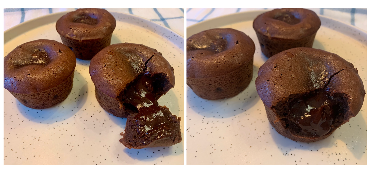 차가워진 상태에서는 가운데 부분이 부드러운 초콜렛 가나슈 같은 제형으로 변한다. 그대로 먹어도 좋지만 렌지에 30초 정도 돌려서 따끈하게 즐기면 더 좋다. 대신 30초 이상 돌리면 흘러내리는 초콜렛도 같이 익어서 평범한 초콜렛 머핀처럼 되니 너무 오래 두지는 말 것 ! 한 번에 많이 만들어서 하나씩 냉동해뒀다가 렌지에서 살짝 해동 후 30초 가열 과정을 거쳐도 된다. 만들자마자 맛보는 것만큼은 아니여도 충분히 달콤하다.