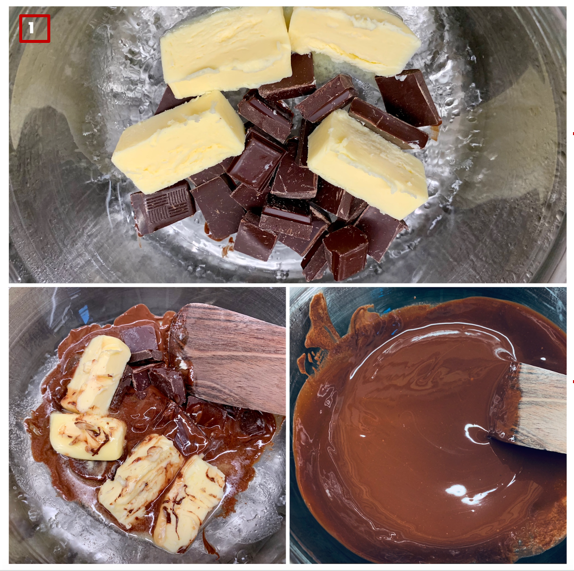 1. 작은 조각으로 자른 초콜렛과 버터를 중탕으로 녹인다. 뭉치는 곳 없이 크림처럼 부드럽게 섞이면 일단 완성 !